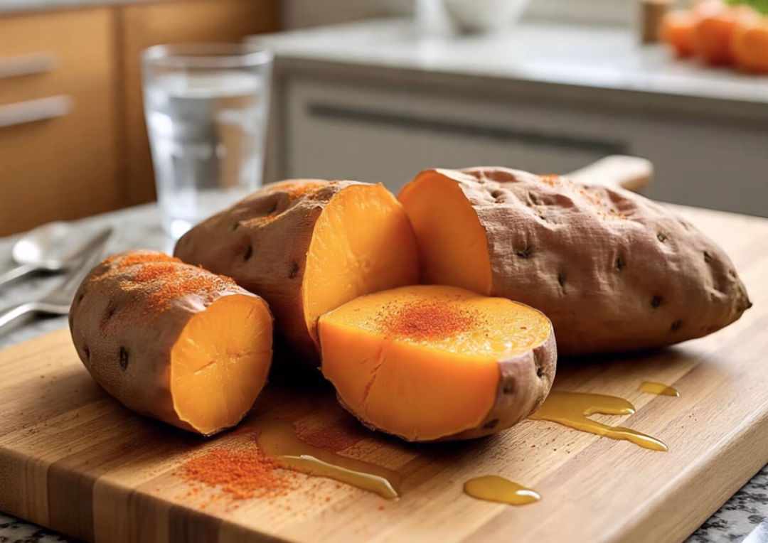 Khoai lang là một trong những thực phẩm giàu vitamin A nhất. Một củ khoai lang nướng nguyên vỏ cung cấp khoảng 1.400 mcg vitamin A, chiếm 156% lượng khuyến nghị hàng ngày (DV). Vitamin A trong khoai lang ở dạng beta carotene, có thể giúp phòng tránh bệnh thoái hóa điểm vàng do tuổi tác. Ngoài ra, khoai lang cũng ít calo, giàu chất xơ, vitamin B6, C và kali, chỉ số đường huyết thấp, hỗ trợ kiểm soát lượng đường trong máu.