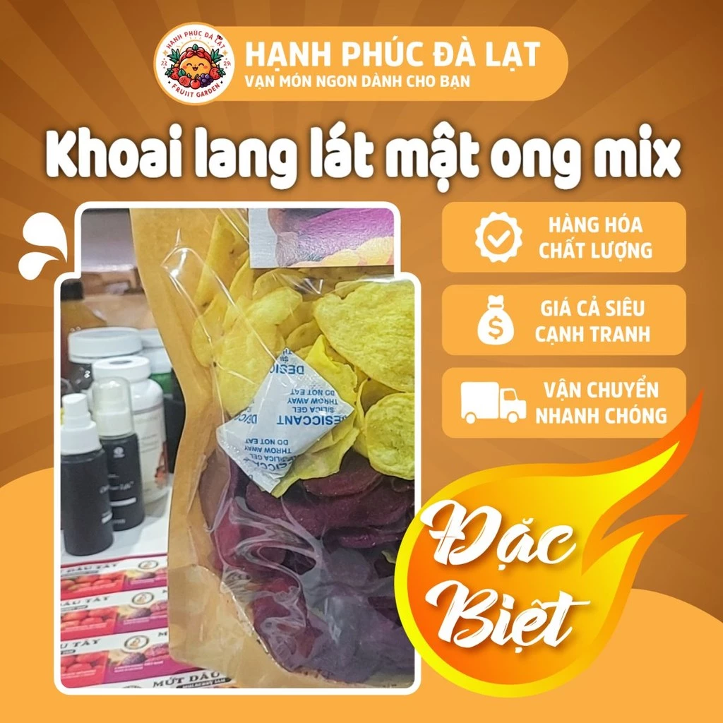 - Chất lượng: Sản phẩm KHOAI LANG LÁT SẤY MẬT ONG MIX 2 LOẠI (VÀNG + TÍM) GIÒN, XỐP, NGỌT NHẸ – HẠNH PHÚC ĐÀ LẠT được làm từ khoai lang tươi ngon và có quy trình sản xuất nghiêm ngặt, đảm bảo vệ sinh an toàn thực phẩm.