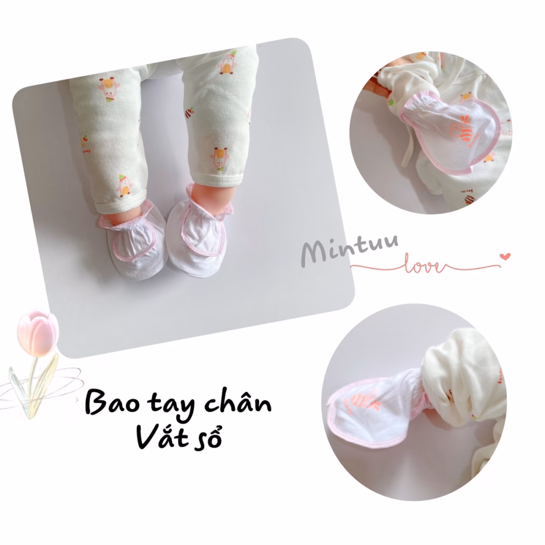 - Bao tay bao chân sơ sinh có thiết kế vắt sổ giúp thoáng mát và mềm mại.